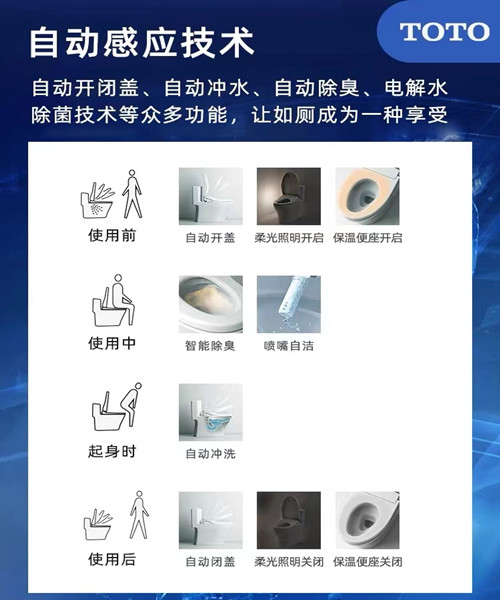 智能马桶盖有自动前后摆动冲洗、强力冲洗、按摩冲洗、前部冲洗(女性专用);智能马桶盖在寒冷冬季也可舒适地使用,具有高、中、低3档温度调节功能;智能马桶盖冲洗后,可用轻柔的暖风烘干;智能马桶盖着座后开始除臭,离座约一分钟后自动停止。在清洗过程中,智能马桶盖除臭不会停止;特别设计的方位指示灯;操作更便捷。